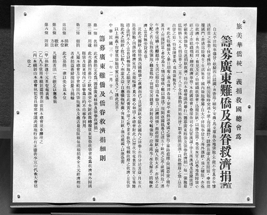 ????“海外僑胞的捐款抗日活動最早起于1927年的濟南慘案。1931年到1945年中國抗戰(zhàn)的14年間,捐款救國是海外發(fā)動僑胞最廣泛、參與人數(shù)最多的抗日救亡運動?!苯T市博物館副館長張一知說。