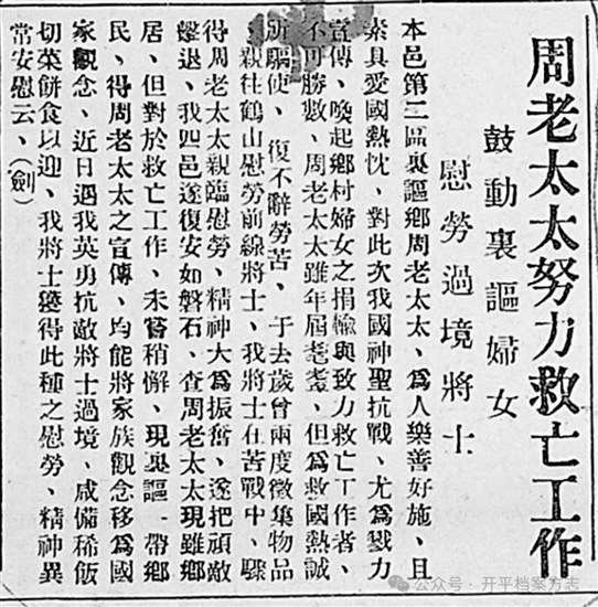 ????恩平僑眷馮定霄將丈夫從巴拿馬寄來的1000美元全部捐出支持抗日,并送獨子加入抗日武裝。60多歲的開平僑眷方玉蓮(人稱“周老太太”),手持拐杖,與“婦抗”隊員走街串巷,發(fā)動群眾募捐衣物、制作軍鞋,并徒步幾十公里,親自將衣物送往新、鶴抗日前線。在中共地方組織支持下,她還冒險越過日軍封鎖線,赴香港動員旅港鄉(xiāng)親募捐。其愛國義舉廣受贊譽,被地方當局授予“婦女先鋒”“老猶救國”錦旗,她的事跡在五邑地區(qū)傳為佳話。