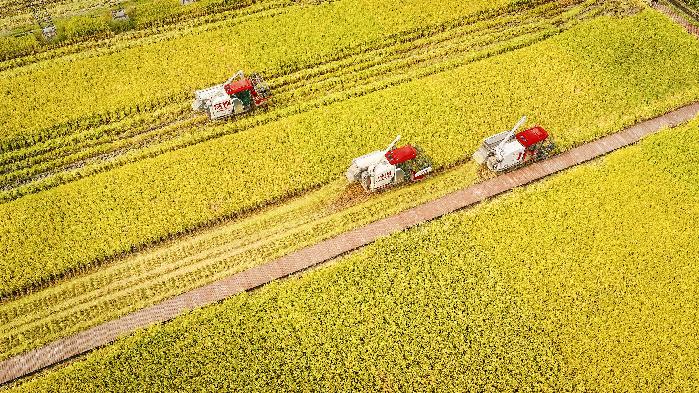 △2025年9月14日,四川成都崇州市隆興鎮(zhèn)十萬(wàn)畝糧食綜合示范基地水稻喜獲豐收。
